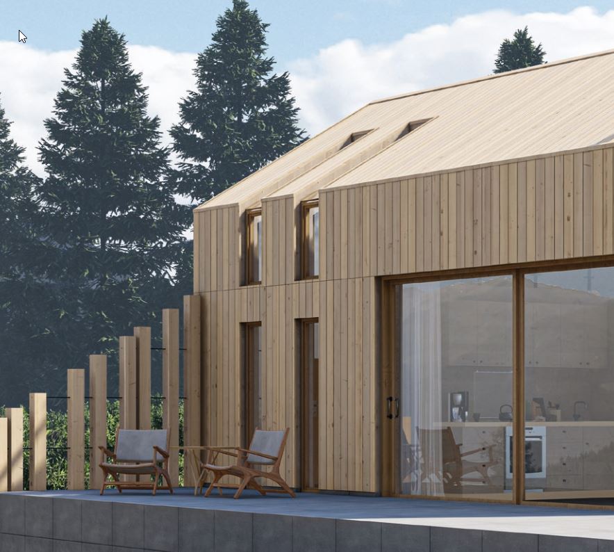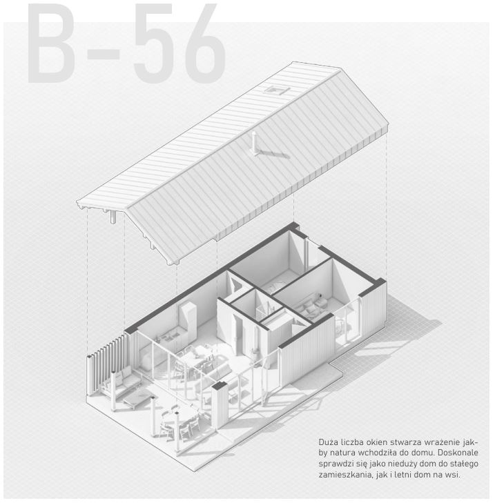 Dom mieszkalny dla dwóch osób z pokojem gościnnym. Składa się z dwóch sypialni o powierzchni 11,5 m² każda, jednej łazienki o powierzchni 5,3 m², przedpokoju o powierzchni 4,5 m² oraz salonu z kuchnią o powierzchni 24,7 m². Elewacja jest połączeniem ka-