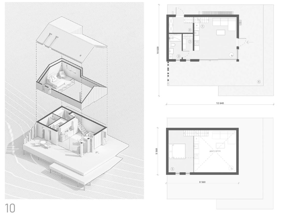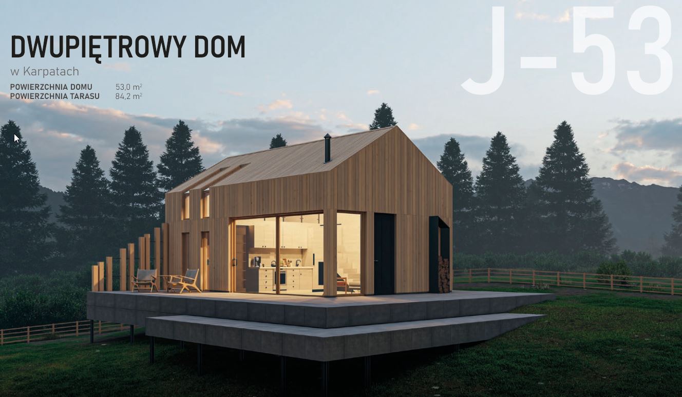 Charakterystyczną cechą projektu jest obecność drugiego poziomu w domu - pozwoliło to na racjonalne wykorzystanie przestrzeni, jak to tylko możliwe. Jednocześnie pozwoliło to ukryć sypialnię przed światem zewnętrznym. W ten sposób na powierzchni 53 m² udało nam się wygodnie zaaranżować sypialnię, kuchnię z salonem, przestronną łazienkę, mini garderobę oraz przestronne pomieszczenie techniczne, w którym gdzie można przechowywać niezbędny sprzęt do aktywności na świeżym powietrzu. Taras wokół domu można dostosować do ukształtowania terenu, a nawet częściowo wysunąć w stronę np. stawu nad jego toń.