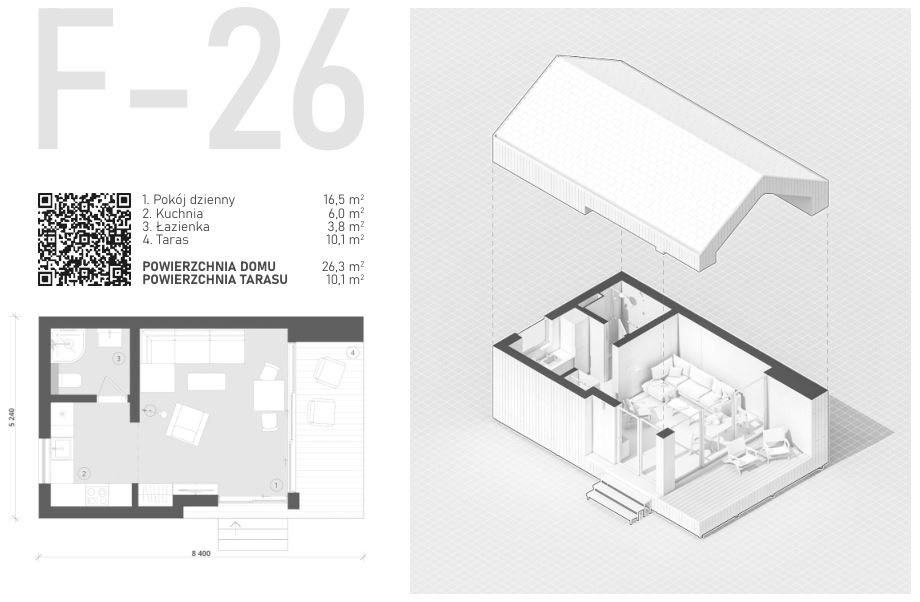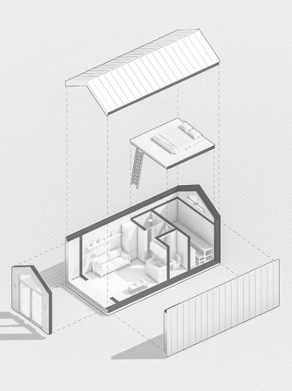 HUT - mały domek, ale „cieplutki”. Dom jest kompaktowej wielkości, a jego całkowita powierzchnia wynosi 29 m² (w tym dodatkowe miejsce do spania pod dachem) plus 2,3 m² tarasu. Jest funkcjonalny, bo oprócz pokoju dziennego z kuchnią, oddzielną toaletą