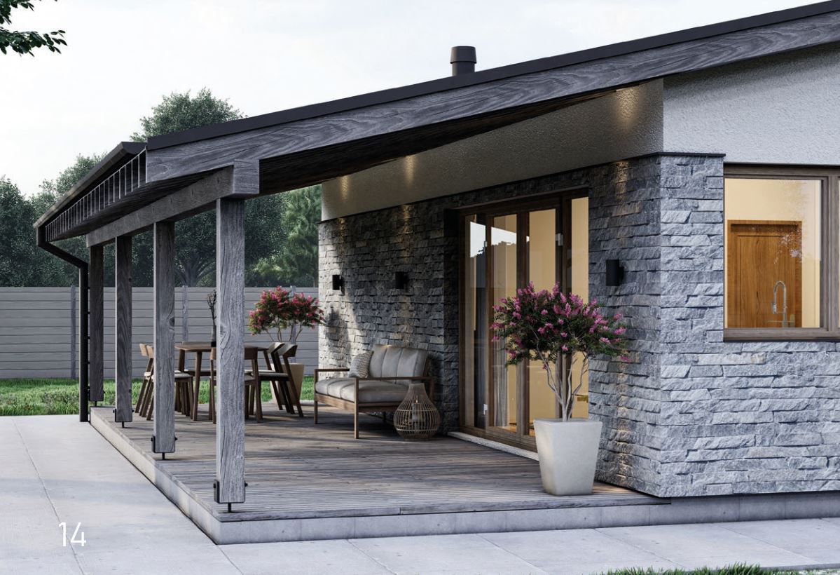 mienia i tynku. Wzdłuż podłużnej części zaprojektowano duży taras, który latem może służyć jako główne wejście do domu. Łączy on