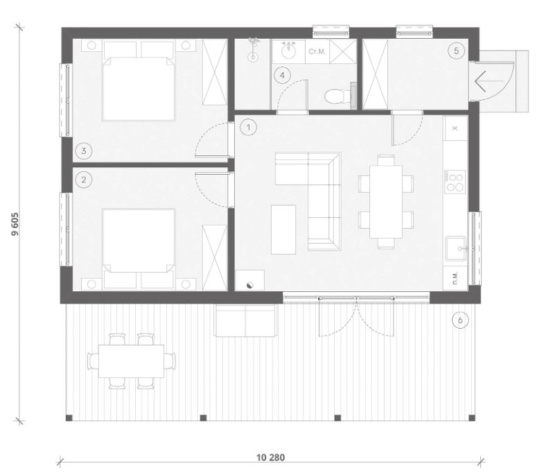 Kompaktowy dom z dwiema sypialniami i jedną łazienką oraz wspólnym salonem połączonym z kuchnią, przez który jest główne wejście do domu. Całkowita powierzchnia salonu wynosi 30,8 m², więc zmieści tam się stół na 6 osób. Obok jest taras o powierzchni 17,3 м². W drugiej części domu znajduje się łazienka - 3 m², garderoby i sypialnie - 11,1 m² każda.